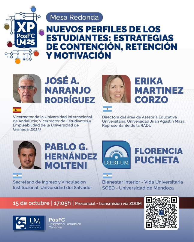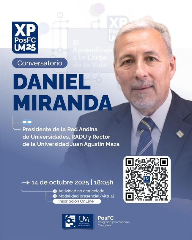 La Secretaría Ejecutiva de la Red Andina de Universidades (RADU), junto con el rector de la Universidad Maza y presidente de la Red, Dr. Daniel Miranda, anunció la realización de “Experiencia Posgrado y Formación Continua 2025”, un encuentro que tendrá lugar los días 14, 15 y 16 de octubre, de 16 a 20 h, con acceso libre y gratuito.