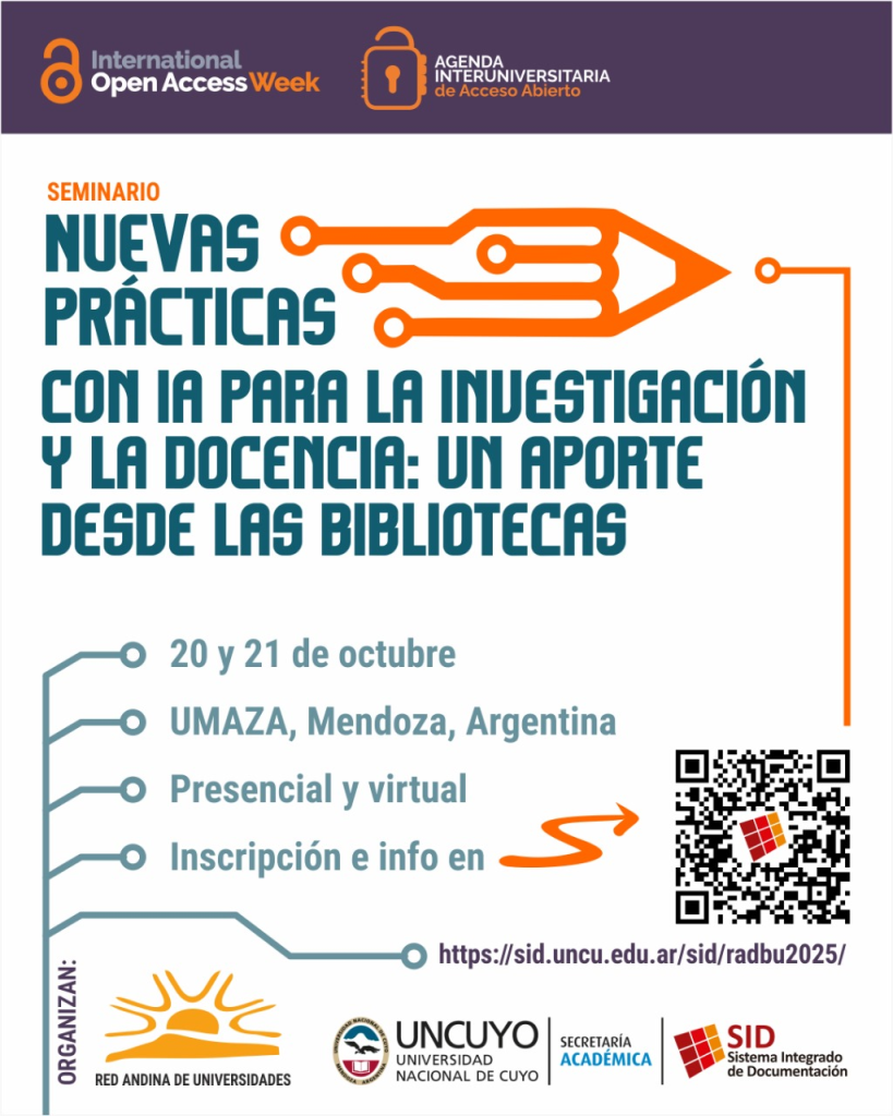 La Red Andina de Universidades invita a participar del seminario “Nuevas prácticas con IA para la investigación y la docencia: un aporte desde las bibliotecas”, que se realizará los días 20 y 21 de octubre con modalidad híbrida, en la Universidad Juan Agustín Maza.